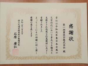 令和元年東日本台風の災害対応について、国土交通省関東地方整備局長より感謝状を頂きました。